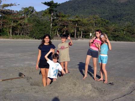 -Mas você pode brincar aqui onde não está filmando...Disse o segurança querendo ajudar. -Aqui é longe... E eu quero fazer outro buraco na areia porque tamparam o nosso... Então o segurança falou meio sério, meio brincando: -AHHH, então vocês que fizeram aquele buraco na frente dos chalés?!!! Sabia que me deu o maior trabalho pra encher de areia de novo???? Tô suando até agora! Bom...Depois dessa saímos de fininho dando muita risada da cara do Gabriel e do Bernardo!!! Que figuras! |
