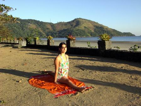 A Tina se inspirou na calmaria de um fim de tarde para estender a canga e fazer muiiiiito alongamento. |