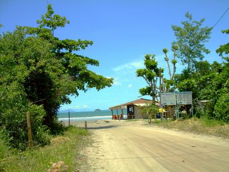 Ao sair da BR 101 você entrará na Estrada do Estaleiro, são cerca de 900m de estrada plana de terra, logo avistará a areia da praia. O quiosque à direita é o "Toca do Guaruçá", da D. Semiramis. Foto cedida pelos proprietários do quiosque. |