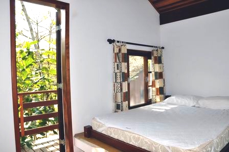 No mezanino há uma cama de casal. Não aconselhamos seu uso por crianças pequenas ou pessoas com dificuldades com escada marinheiro. A porta que vemos no mezanino abre para a sacada. Algumas sacadas estão na altura das copas das árvores, bom para observar os passarinhos. |