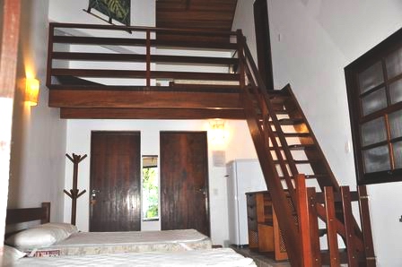 Cada suíte é constituída por quarto, banheiro e mezanino. No térreo há 01 cama de casal e 01 de solteiro, no mezanino há 01 cama de casal. A suíte pode acomodar no máximo 5 pessoas (crianças e bebês entram na contagem). À direita está a escada de acesso ao mezanino. |